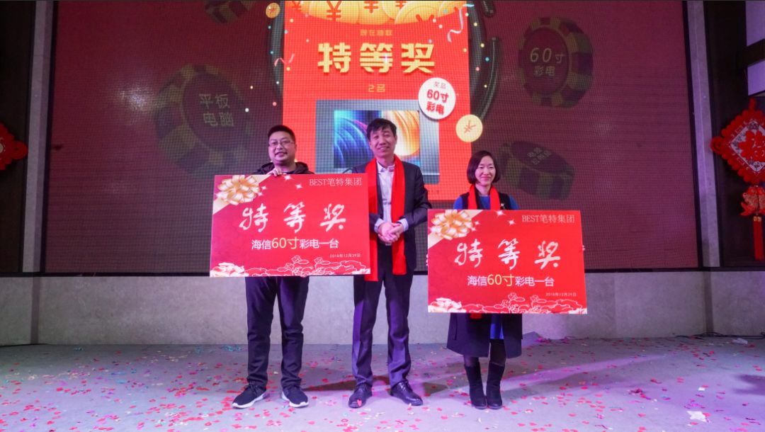 最后,由董事長與各集團領導上臺致祝酒詞,放祝酒歌,在大家雷鳴般的掌聲當中,晚宴正式開始,也順帶引出了最后一個也是最激動人心的環節:抽獎。