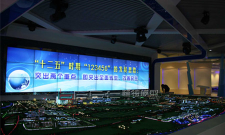 本沙盤盤面使用液晶屏制作,配合水晶建筑體塊;背面安裝液晶拼接屏;頂部安裝投影儀。沙盤內容與背景影片、盤面影片、頂部投影相結合,達到立體、協調展示的視覺效果